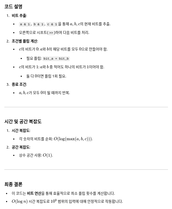 주어진 문제는 **세 개의 양의 정수 aa, bb, cc**가 주어질 때, 비트 OR 연산을 통해 a OR b = c를 만족시키기 위해 a와 b의 비트를 뒤집어야 하는 최소 횟수를 구하는 문제입니다.