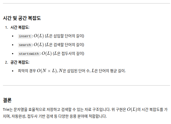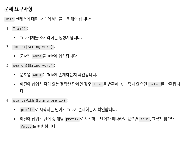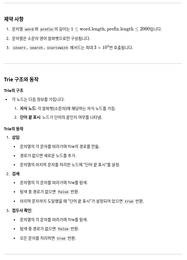 이 문제는 Trie(트라이) 자료 구조를 구현하는 것입니다. Trie는 문자열을 효율적으로 저장하고 검색하기 위해 사용되는 트리 형태의 자료 구조입니다. 이 자료 구조는 주로 자동완성, 단어 검색, 접두사 검색과 같은 작업에서 사용됩니다.