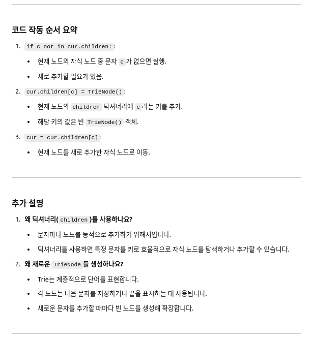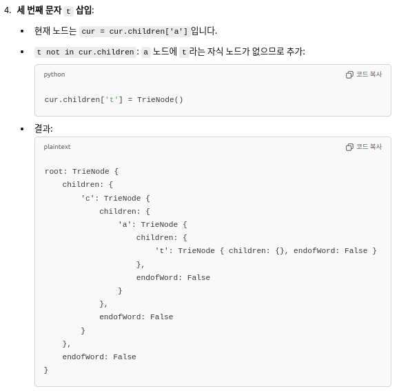 cur.children[c] = TrieNode() # 해당 문자를 가진 새로운 TrieNode를 추가