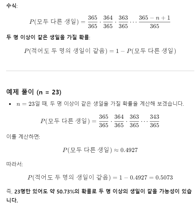 - 생일이 365일 중 고르게 분포한다는 가정 아래, 사람들이 많아질수록 가능한 생일의 조합이 급격히 줄어들기 때문에 두 명 이상이 같은 생일을 가질 확률이 빠르게 증가합니다.