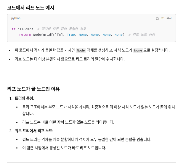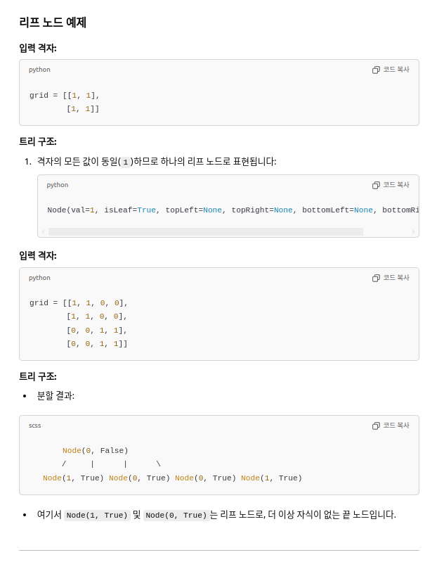 - 격자가 모두 동일한 값을 가지면 리프 노드를 반환하여 종료.