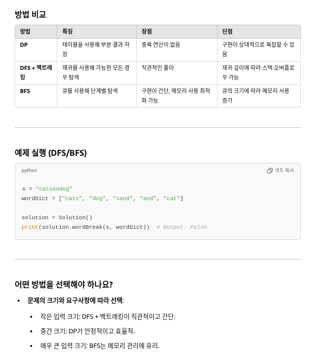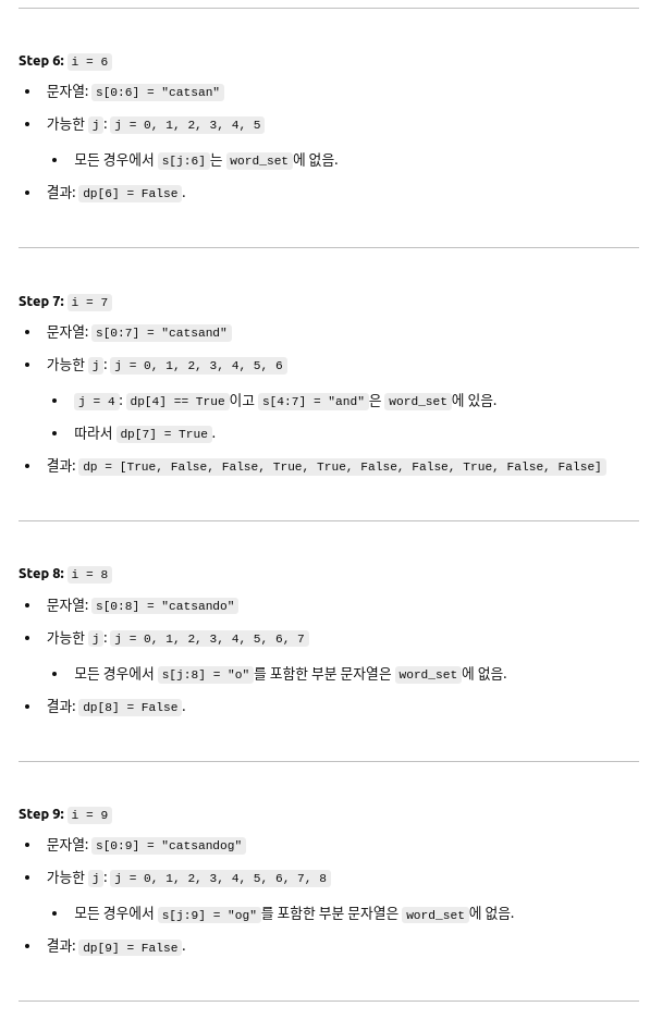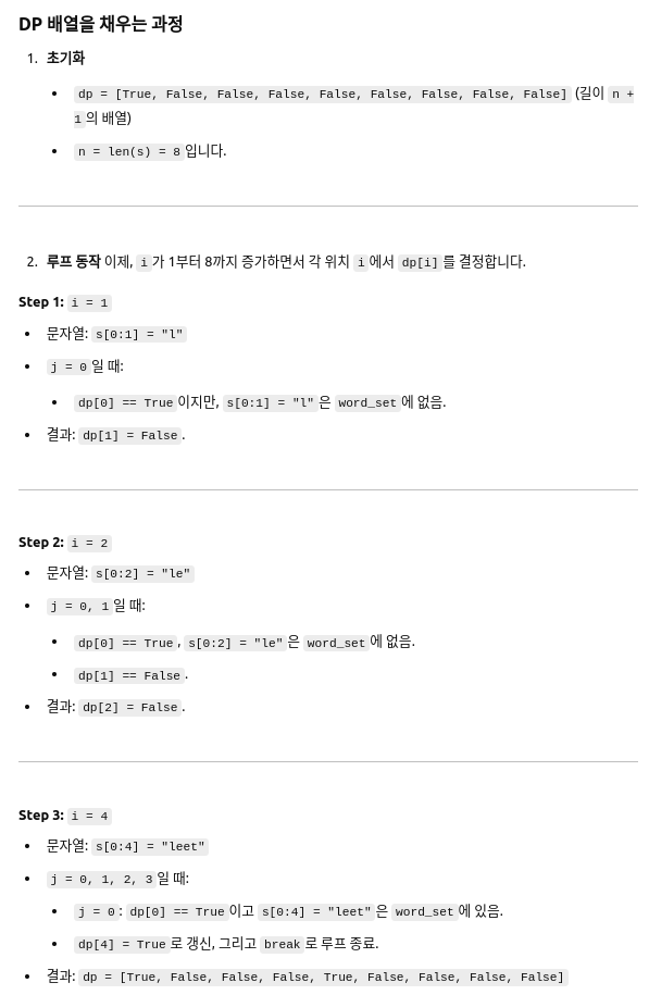- 어떤 j(0 ≤ j < i)에 대해, dp[j] == True이고 s[j:i]가 wordDict에 포함되어 있어야 합니다.