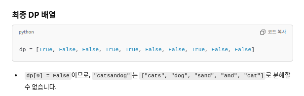 - 기본 상태: dp[0] = True (빈 문자열은 항상 분해 가능).