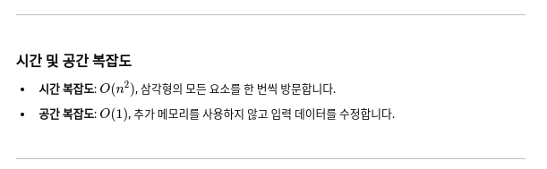- 별도의 추가 메모리 공간을 사용하지 않고, 삼각형 데이터를 직접 수정하며 계산합니다.