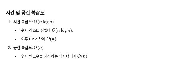 - 정렬 및 DP를 사용하여 숫자를 순차적으로 탐색.