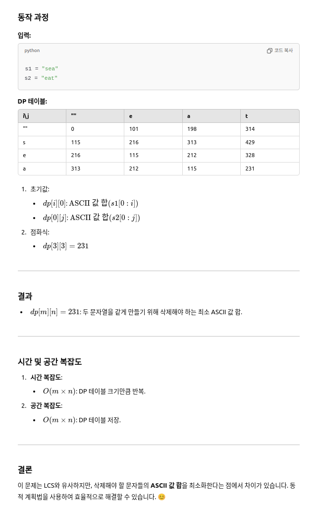 # DP 테이블 생성: dp[m][n]은 s1[0:m]과 s2[0:n]을 같게 만들기 위해 삭제해야 하는 최소 ASCII 값 합