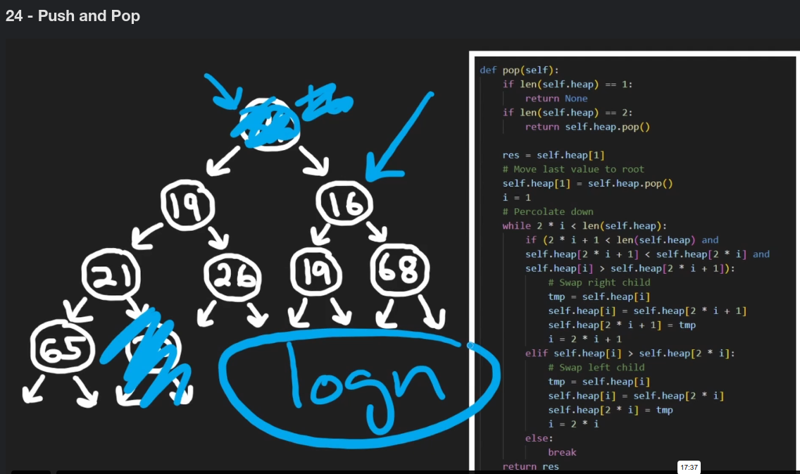 - self.heap 개수가 2개 이면, 데이터가 1개 있는 것임. 그래서, self.heap.pop()
