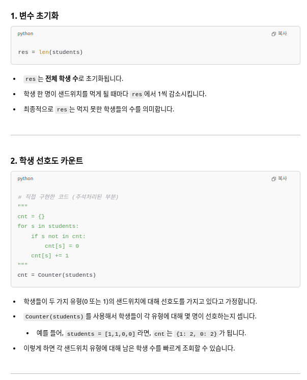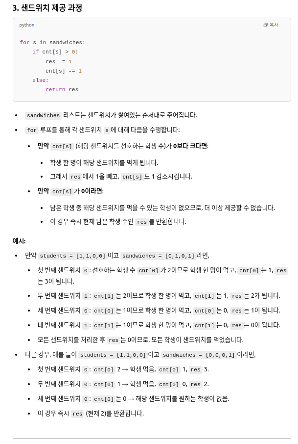 이 코드는 학생들의 선호도와 샌드위치의 종류에 따라 학생들이 먹을 수 없는 인원의 수를 계산하는 문제를 해결하는 방법입니다. 문제의 핵심은 학생들이 선호하는 순서대로 샌드위치가 주어질 때,
