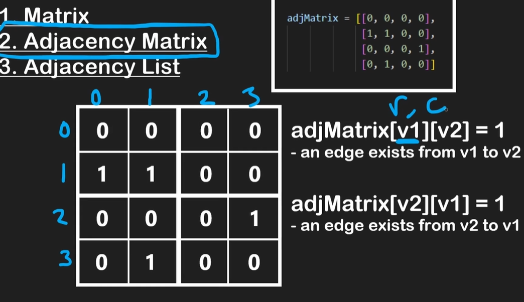 adjMatrix[1][0] = 1 : from vertex 1 to vertex 0