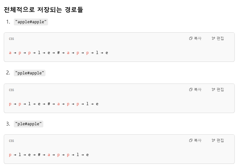 | prefix#suffix | 접두사를 기준으로 트리를 탐색 | 접미사 검색이 어려움 (Trie는 뒤를 잘 못 봄) |