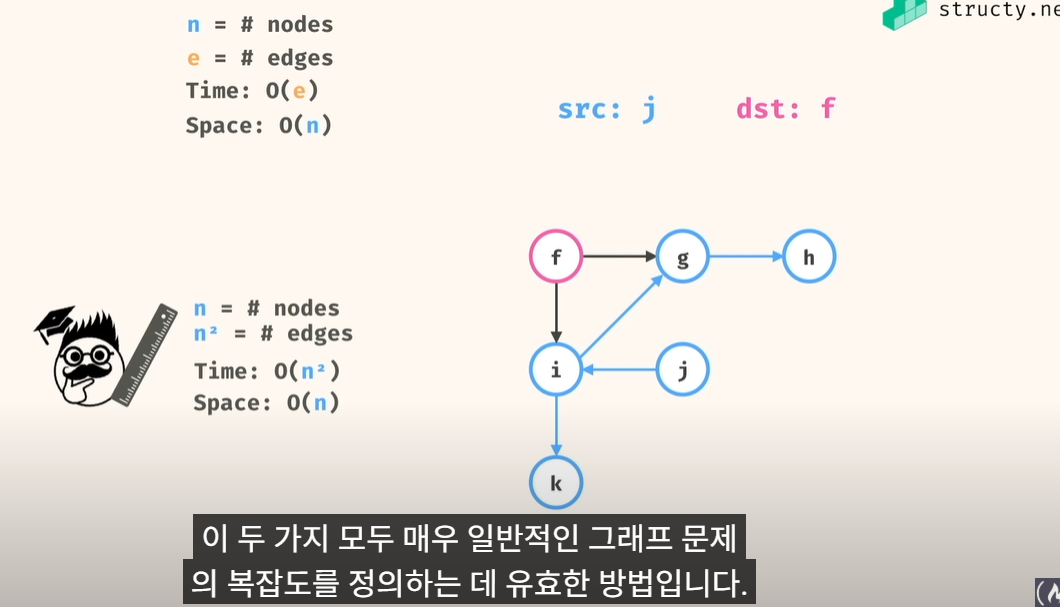 에지 개수가 n^2 되는 경우는 양방향 일때. => 시간 복잡도는 O(n^2), 공간복잡도는 O(n)
