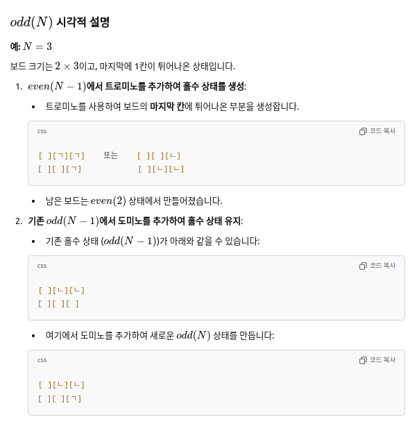 - odd(n−1): 기존 홀수 상태에서 도미노를 추가로 덮은 경우.