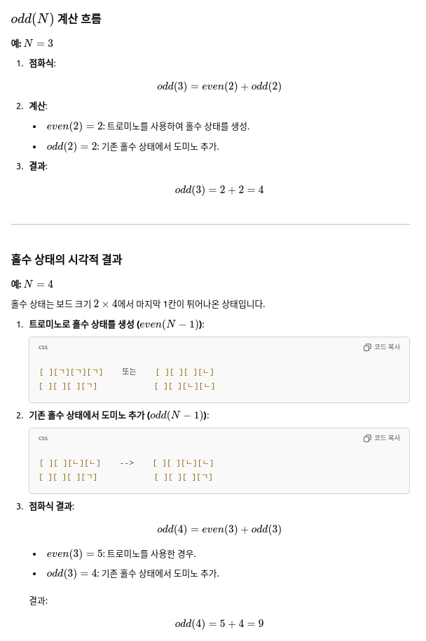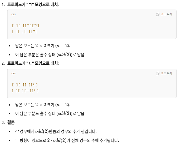 - 2⋅odd(n−2): 마지막 세 칸을 트로미노로 덮은 경우 (두 방향 포함).
