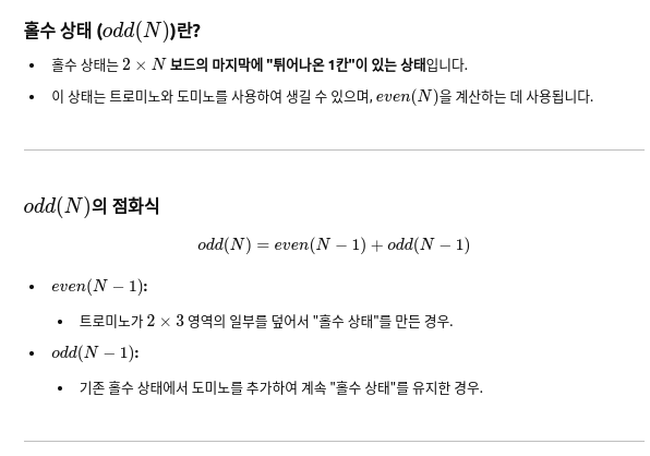 - 트로미노는 2×3 공간을 덮으면서 남은 공간을 홀수 상태로 만들고, 남은 부분을 다시 odd(n−2)를 기반으로 계산해야 합니다.
