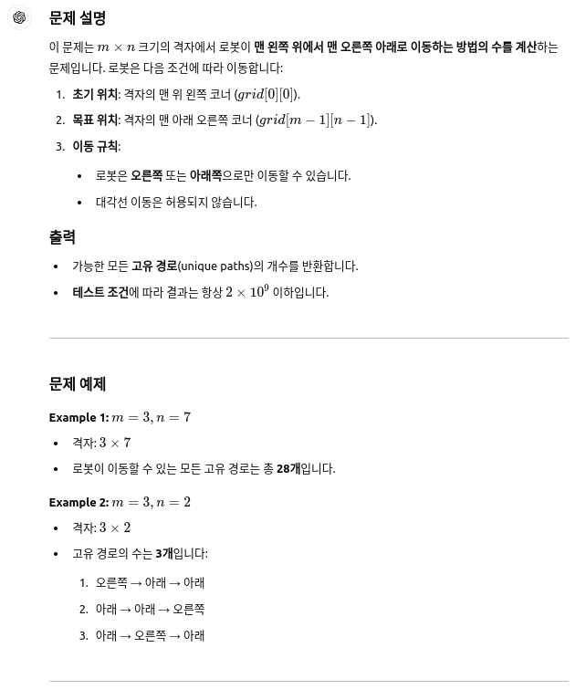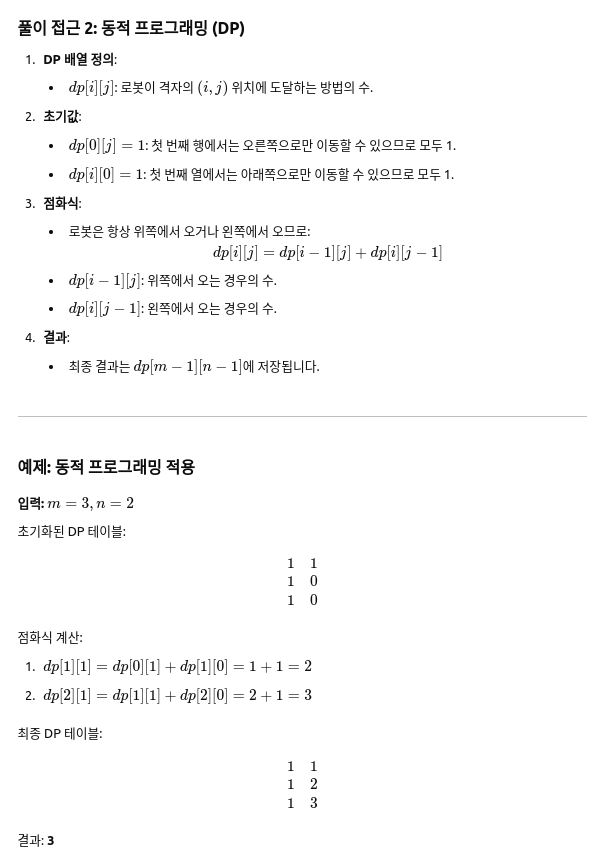 - 첫 번째 행은 모두 1: dp[0][j] = 1 (왼쪽으로만 이동하므로)