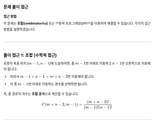 - 크기가 m x n인 격자에서 (0, 0)에서 시작해서 (m-1, n-1)로 가는 모든 경로의 개수를 구하는 문제.
