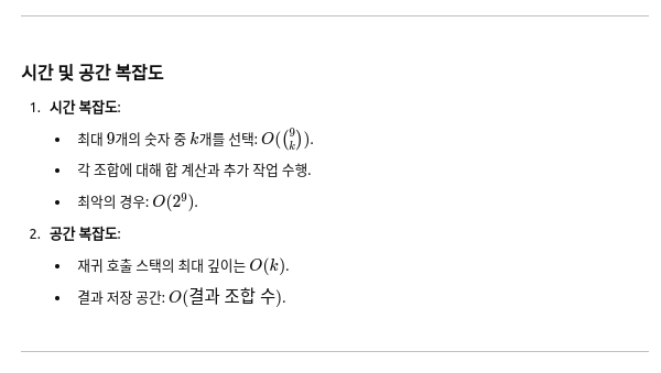 - 숫자는 오름차순으로 탐색하며, 중복 조합을 방지.