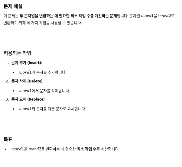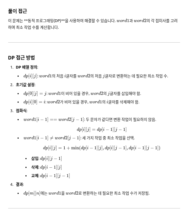 주어진 두 문자열 word1, word2를 서로 같게 만들기 위한 최소 연산 횟수를 구하는 문제예요.