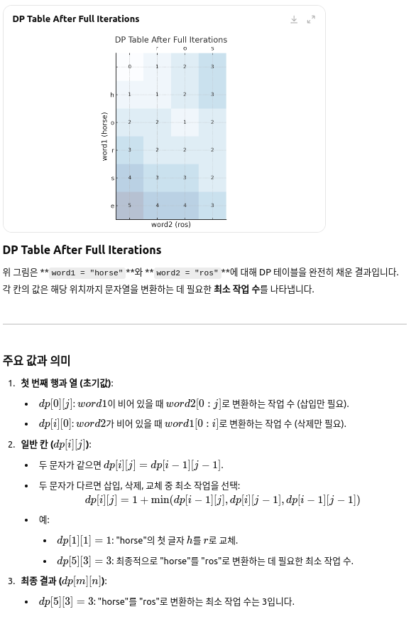 DP 테이블의 최종 값은 문자열을 변환하는 모든 가능한 경로를 고려해 최적의 변환 비용을 계산한 결과입니다. 이를 통해 삽입, 삭제, 교체 작업을 효율적으로 비교할 수 있습니다.