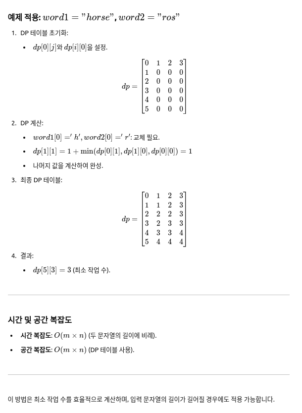 - 이후, 이 값을 기반으로 나머지 테이블 값을 채우며 두 문자열의 변환 비용을 계산합니다.