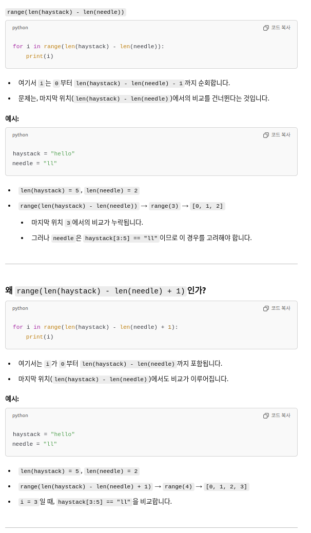 # range(len(haystack) - len(needle) + 1): 마지막 위치까지 포함하여 순회