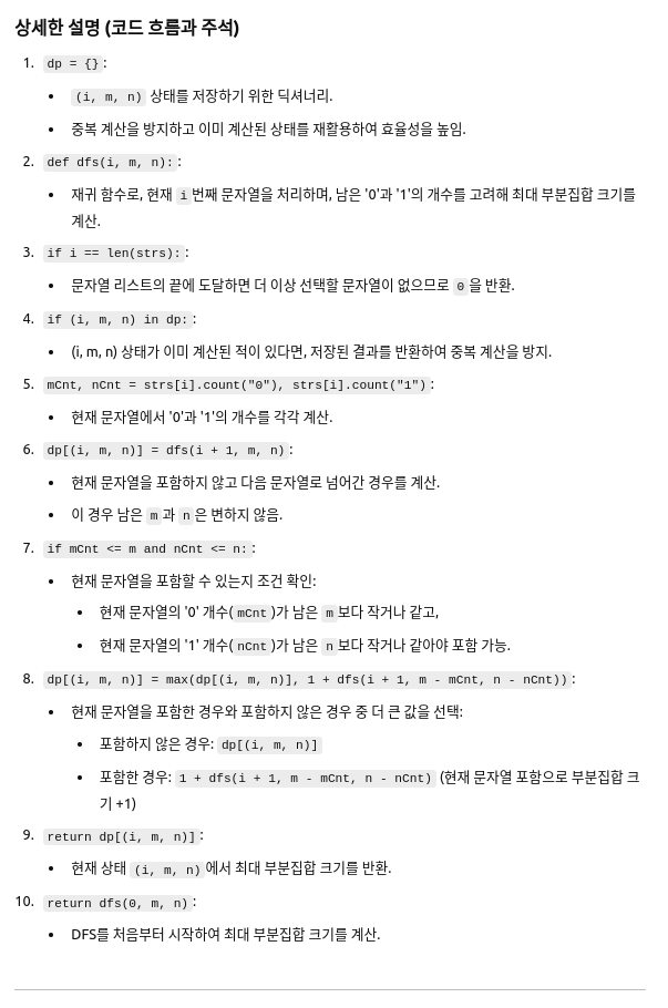 474. Ones and Zeroes https://youtu.be/miZ3qV04b1g?si=ieg8qGyjhzei0dQq class Solution: def findMaxForm(self, strs: List[str], m: int, n: int) -> int: # memoization dp = {} # 메모이제이션을 위한 딕셔너리 생성, 키는 (i, m, n), 값은 최대 부분집합 크기 def dfs(i, m, n): if i == len(strs): # 문자열 리스트를 모두 탐색했을 경우 return 0 # 부분집합을 더 이상 추가할 수 없으므로 0 반환 if (i, m, n) in ..