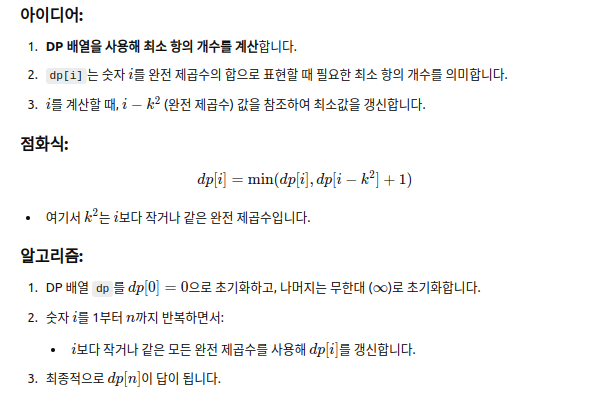 279. Perfect Squares # 완전 제곱수의 합이 n 이 되는 요소 개수 찾기 # 그런데 그 요소 개수가 최대한 적어야 해서. # 제곱수는 큰수로 이뤄저 있어야 하므로, 큰수부터 검색하는것이..# DP 또는 BFS 로 풀수 있음  1. Dynamic Programming (DP) 풀이  예제)class Solution: def numSquares(self, n: int) -> int: """ 문제 설명: 정수 n을 완전 제곱수들의 합으로 표현할 때, 필요한 최소 항의 개수를 구하는 문제. 완전 제곱수는 1, 4, 9, 16과 같은 수를 의미합니다. """ # DP 배열 초기화 # dp[i]는 숫자 i를..