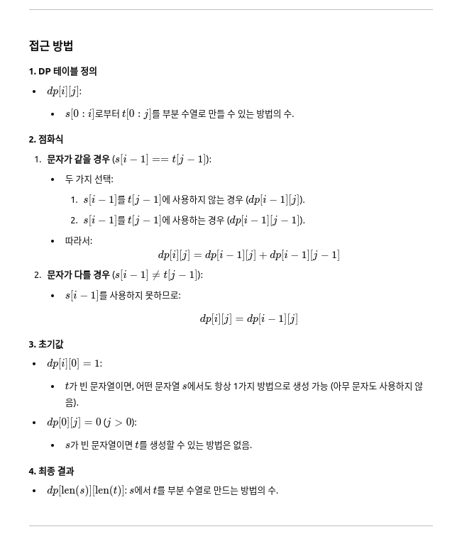 115. Distinct Subsequences 두 문자열 s, t가 주어질 때, s로부터 t를 만들 수 있는 서로 다른 subsequence의 개수를 구하세요.subsequence: 문자의 순서는 유지하면서, 일부 문자를 생략한 것각 문자는 한 번만 사용 가능📌 예시 1Input: s = "rabbbit", t = "rabbit" Output: 3s에서 'b'가 3번 등장하기 때문에, 각각을 생략하는 방식으로 3가지 방법이 존재📌 예시 2Input: s = "babgbag", t = "bag" Output: 5다양한 'b', 'a', 'g' 조합이 존재해서 총 5가지 방법으로 만들 수 있음🔧 핵심 개념: dp[i][j]의 의미표현의미dp[i][j]s[0:i]로 t[0:j]를 만들 수 있는 su..